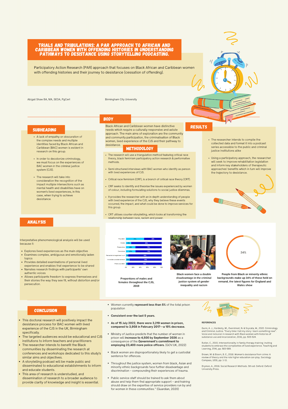 - Trials and tribulations: A par approach to African and Caribbean women with offending histories in understanding pathways to desistance using storytelling podcasting, Abigail Shaw, Birmingham City University