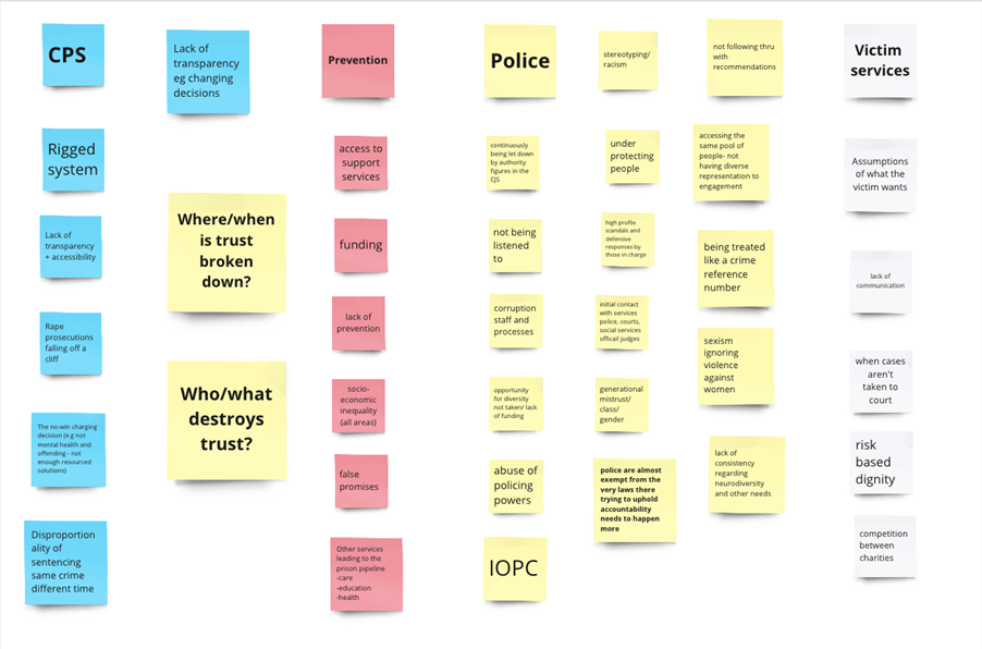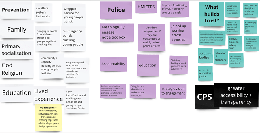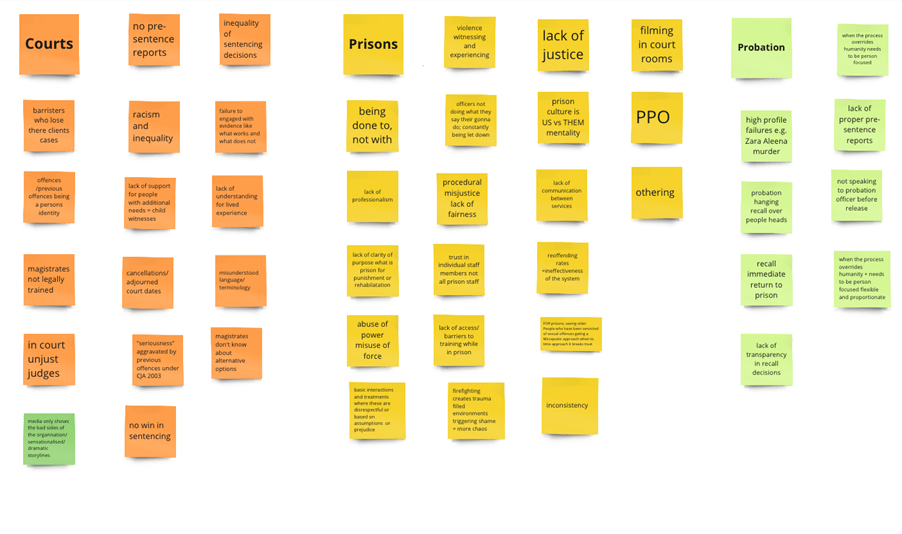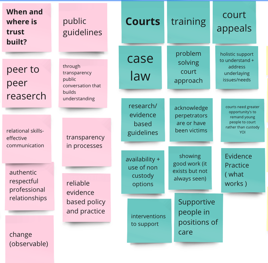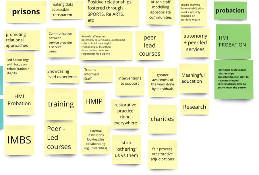 Participants were then asked to share their thoughts on the group’s collective responses. They discussed the fact that lack of trust often starts long before involvement in the criminal justice system with lack of trust in the care system, education and health agencies cited as primary examples. This lack of trust is then transferable (i.e., the view that authority figures let you down) and is compounded by lack of understanding or confusion about these systems as well as the criminal justice system. Participants felt that the opaqueness of them creates alienation and pipelines to prison. People in the system described how they had felt dehumanised, labelled and ‘othered’ by their experiences from a young age and how these crushed and shaped their identities. Once in the system, the rigid conditions and stringent expectations of the criminal justice system (e.g. recall and breach of licence) and poor communication (e.g. about delays in court processes) reinforce this lack of trust. This feeds a perception that ‘no-one cares’ about people stuck in the system.
