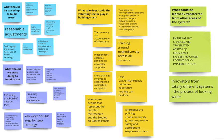 There were calls for greater demonstration of how the system values the people involved in it. Examples of this were that staff training should show the value of professionalisation, with the example of 6-week prison officer training being seen as devaluing staff and the people held in prison, and that there should be greater intermediary support funded for victims and witnesses as well as scope for more reasonable adjustments to meet peoples’ needs. This included better data for understanding the system and the people in touch with it.