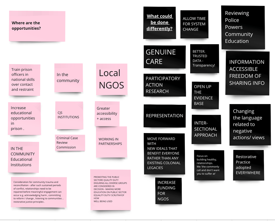 Participants spoke of a loss of trust within the police and prisons due to corruption which taints the reputation of the whole system. Prisons can also in themselves delegitimise the whole criminal system. The politicisation of criminal justice was similarly seen as destroying trust. Overall, there was a sense that relationships are so damaged by the system and within it, that it was a challenge to know where to start with repair and reconciliation (i.e., acknowledging harm, listening to communities affected and committing to reform). This sense of helplessness was extended to ongoing failure of actors and organisations within the system to engage with evidence, acknowledge what is not working, and implement recommendations. Scrutiny bodies, like Independent Office for Police Conduct, which could play a significant role in building trust, were not doing so.